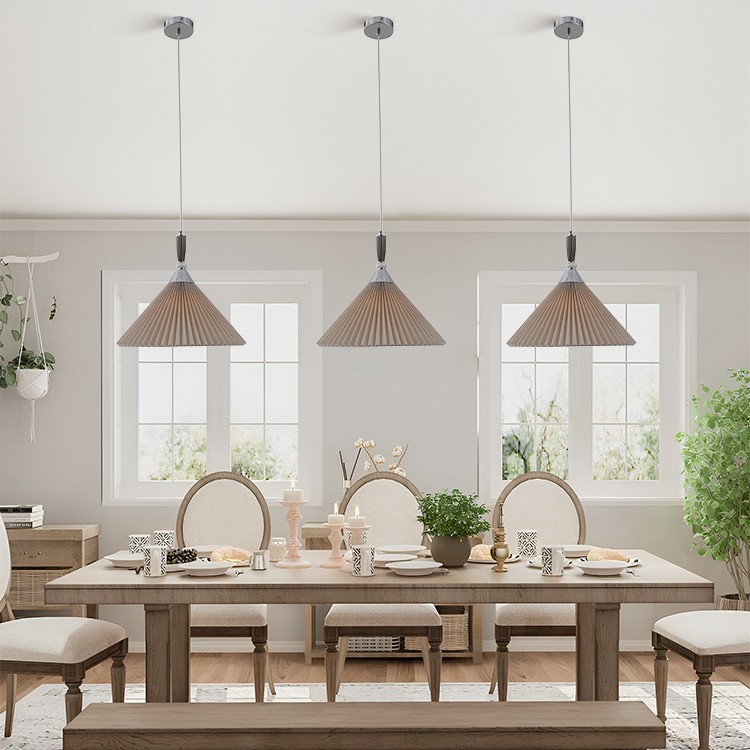Ang 1-light ceramic linen cone shade pendant lamp ay isang moderno at simpleng pag-iilaw ng estilo para sa panloob. Ang katawan ng lampara ay gawa sa solidong bakal, na hindi lamang matibay at matibay ngunit nagbibigay din sa lampara ng isang pakiramdam ng katatagan. Ang lampshade ay gawa sa pleated na tela, na hindi lamang nagdaragdag ng isang malambot na texture sa lampara ng palawit ngunit epektibong nagpapalambot din ng ilaw. Ang taas ng 1-light ceramic linen cone shade pendant lamp ay nababagay, na umaangkop sa iba't ibang mga taas ng kisame at mga pangangailangan sa pag-iilaw, na may saklaw na pagsasaayos ng 1 metro hanggang 2 metro. Ang ibabaw ay ginagamot sa chrome, na nagtatanghal ng isang moderno at high-end na visual na epekto, at partikular na angkop para sa panloob na dekorasyon na humahabol sa isang magaan na istilo ng luho.