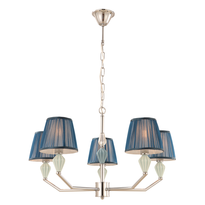 Modernong kagandahan para sa iyong sala. Pagtaas ng iyong puwang sa buhay na may malakas na 5-light drum chandelier na may malakas na pag-iilaw na may ceramic accent, isang obra maestra na pinaghalo ang kontemporaryong disenyo at walang katapusang kagandahan. Nagtatampok ng malulutong na pagtatapos ng chrome, naka-texture na navy blue na mga shade ng tela, at pinong mga accent ng light-blue ceramic at transparent na mga kristal na bola, ang Navy Blue 5-light drum chandelier na may ceramic accent ay nagdaragdag ng isang ugnay ng pagiging sopistikado sa anumang modernong o transitional interior. Dinisenyo para sa tibay at istilo, perpekto ito para sa mga sala, mga lugar ng kainan, o mga daanan ng entry.